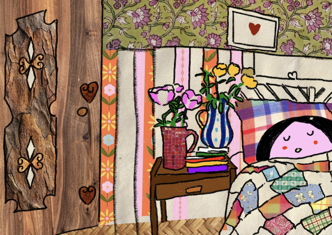 Elle y expérimente avec l'illustration jeunesse et les installations textiles.
